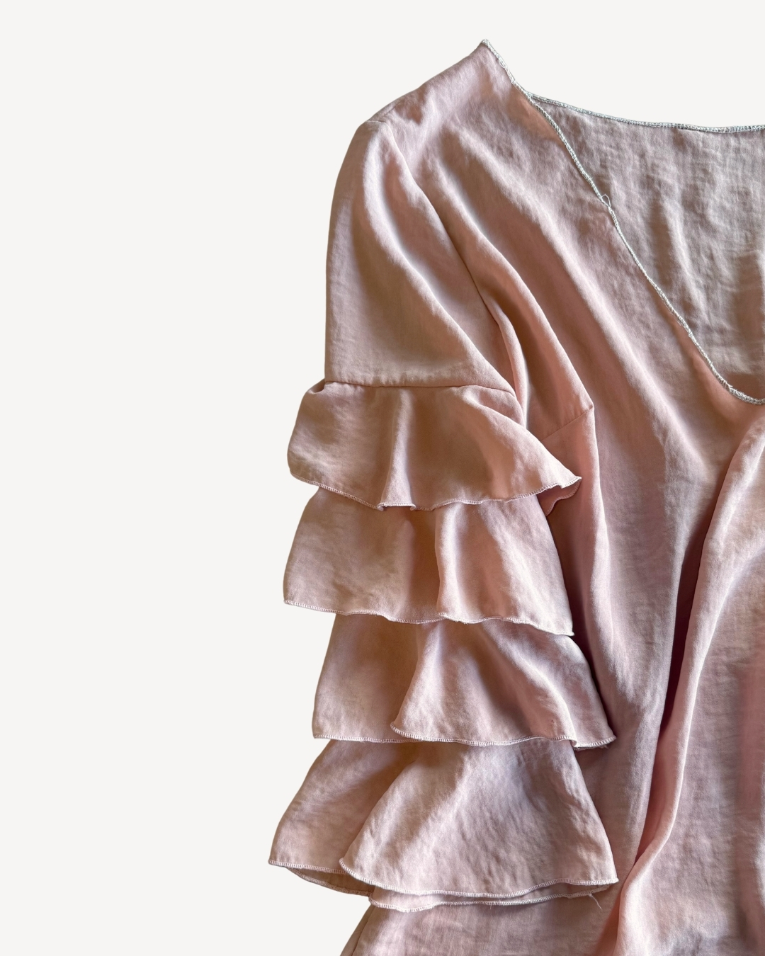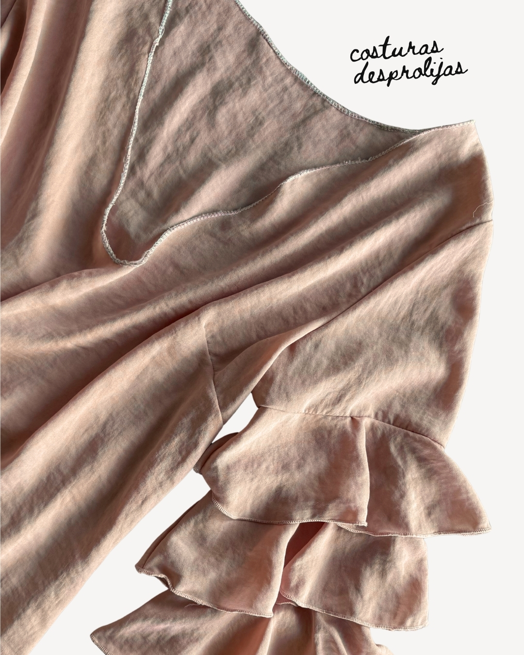 Sisa 22cm / hombro a hombro 46cm / escote 25cm / busto 49cm / largo 85cm / largo de mangas 47cmPronunciado escote en V con costuras que no quisieron ser prolijas ni invisibles. Corte recto. La tela transparenta un poco.